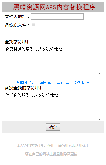 本程序是一款可在网站在线运行,运行后可以对网站的所有目录及子目录文件进行批量的内容操作,如替换大量的繁殖页上的联系方式等等。